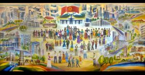 Работа выполнена в авторской технике ручного ткачества и отличается масштабностью художественного замысла, выразительностью образного языка и высоким уровнем исполнительского мастерства. В ней нашли отражение историческая память народа, современное осмысление действительности и образ достойного будущего Кыргызстана.
